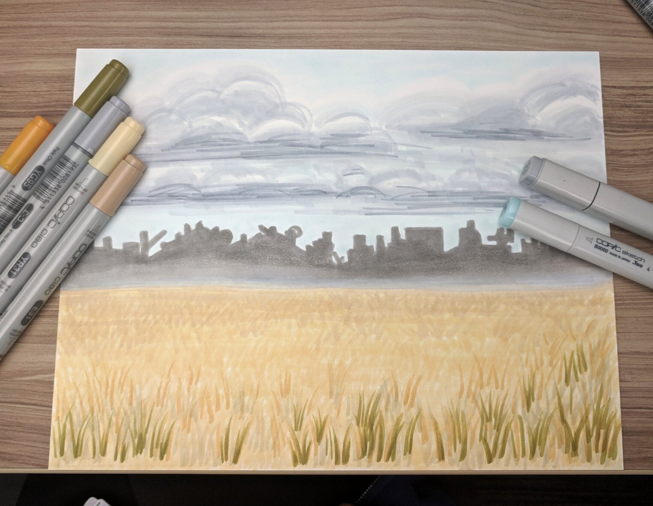 In any art medium, the setting makes a huge difference in defining the tone of the story. Especially since my story is set in a fictional world, I needed to make sure I capture the feeling I want the reader to experience as they make their way through the story. For the opening scene, I created a large field of yellow grass with silhouettes of buildings and junkyards to give a more dystopian feel.
